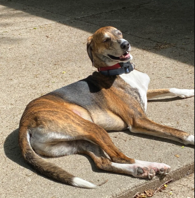 Auggie came into training as a strong, vocal hound mix who had developed some habits that made life tough for his family. Walks weren’t enjoyable because he’d pull hard and bark at other dogs. In the yard, he’d chase cars and ignore recalls completely. He’s a great dog at heart, but the lack of structure was causing frustration on both sides.